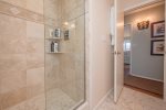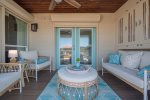 The upstairs primary bedroom has a king size bed, large Apple TV, ceiling fan, an oversized dresser, and French doors (with built-in shutters) that open to a fully furnished private deck/patio overlooking the Bay. This primary bath has a double vanity with two sinks, a window for natural light and a large shower with a bench and toilet in its separate room.