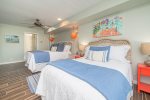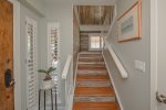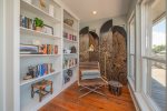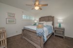 The two guest rooms upstairs have queen beds, ceiling fans, windows with plantation shutters, and Apple TVs.