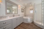 The large primary bath downstairs has a large soaking tub, and a separate shower and private toilet.