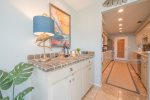 Upon entering the home, you are greeted with an abundance of natural light that highlights the beautiful décor that continues throughout the home. The primary bedroom downstairs has a wall of windows, complete with plantation shutters, overlooking the pool and patio. It also has French doors, with built in shutters for privacy, opening to the pool, hot tub, outdoor kitchen, and bar. This room has a king size bed as well as a full-size bed. It also boasts a large living area complete with a ceiling fan and an Apple TV.