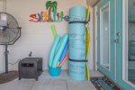 In addition to the above, the downstairs has a large laundry room with brand new large capacity, front loading GE Profile washer and dryer, a soaking sink, folding table, ironing board and iron, steamer, drying rack and more. In addition, there is a commercial ice maker in the garage – perfect to fill the ice bin in the outdoor kitchen/bar or coolers for the boat or beach.