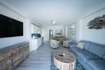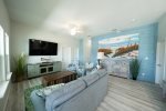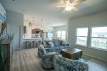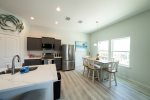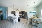 Inside you’ll find a cozy living area with rustic maritime décor, includes a smart TV where you can access all of your favorite entertainment. The sleek modern kitchen comes equipped with all the tools and space you need to prepare your favorite meals as well as a breakfast bar with seating for 4. The charming dining area has large windows to brighten your day while enjoying a family meal with seating for up to 6.