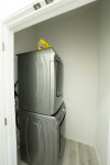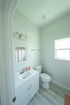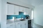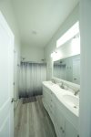 Downstairs you’ll find a quaint and stylish guest suite with a small kitchenette that has a mini fridge, Keurig, a small sink and cabinet space. The cozy living area has a sofa big enough for 3 and a large smart TV for all your entertainment needs. The dining area has luxurious nautical themed seating for up to 4 people to enjoy a meal together. The downstairs bedroom is furnished with a queen bed and dresser, as well as a smart TV. The guest suite also has a private restroom with a walk in shower and sleek modern vanity. Outside the guest suite you’ll find outdoor seating as well as an outdoor shower area to clean off after enjoying our community pool.